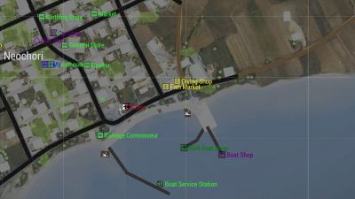 This is an example of where you would buy a boat, A diving suit and where you would sell your fish in Neochori.